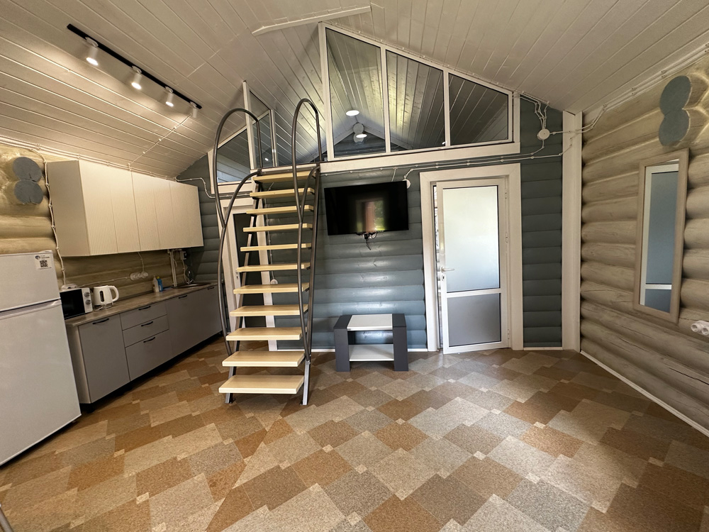 Просторная комната с двуспальной кроватью, мини-кухня оснащена холодильником, микроволновой печью, электрочайником, столовыми приборами. Санузел, душевая с обливочным ведром, парная с дровяной топкой, веранда со столом и лавочками, мангал.