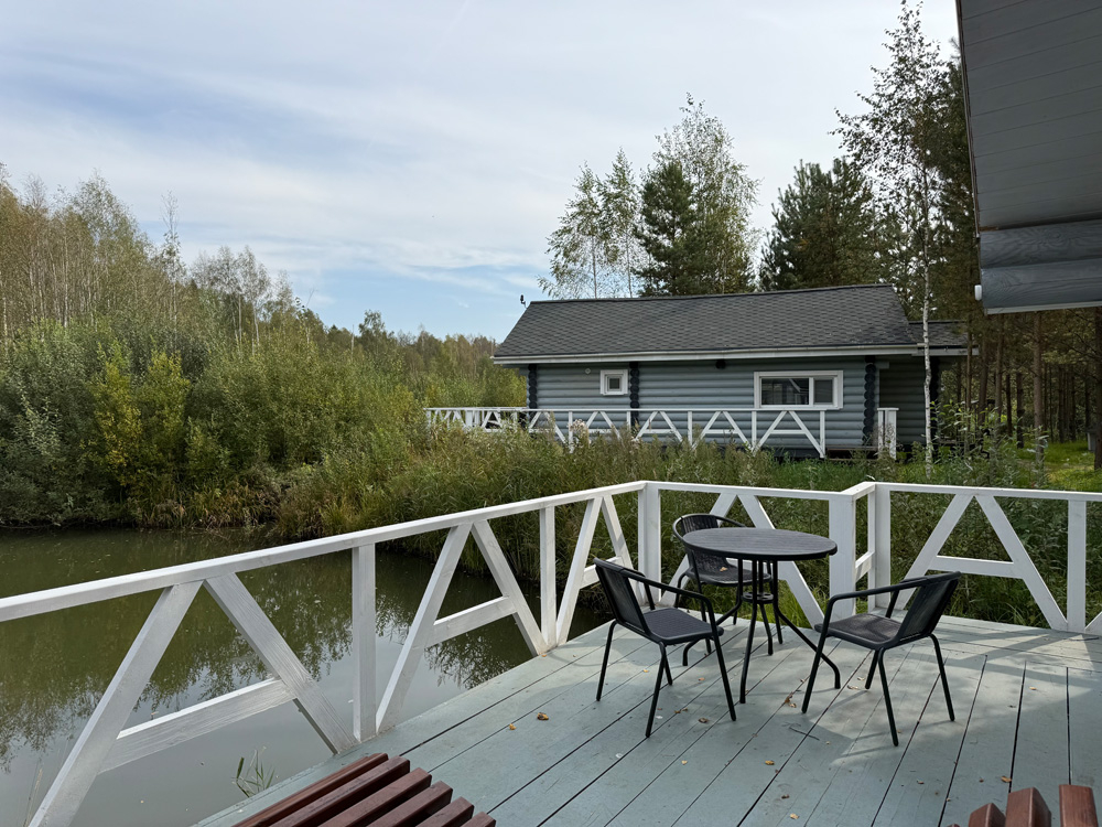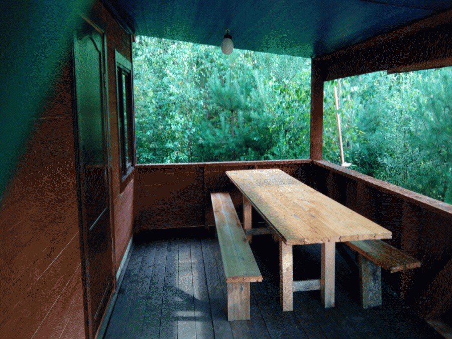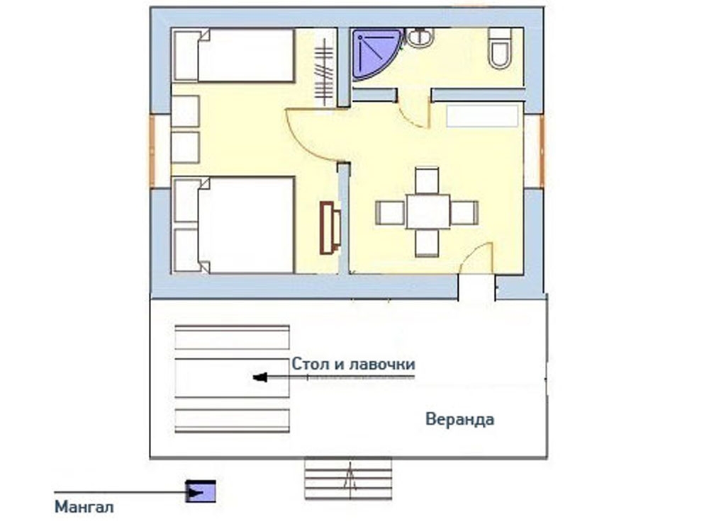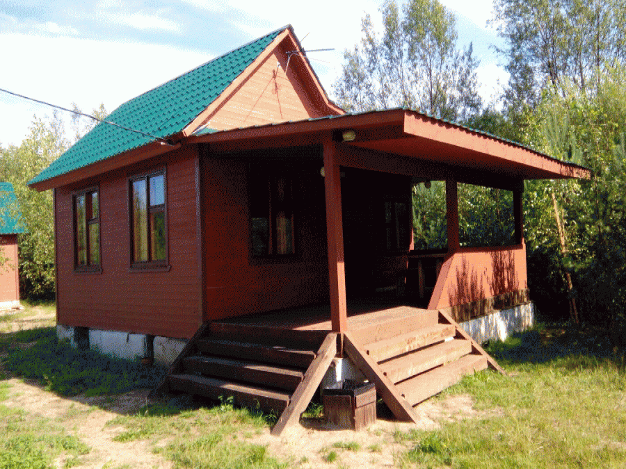 Площадь 42 м2. Гостиная со столом и мини-кухней, спальня с двуспальной кроватью и раскладываемым диваном, большая веранда со столом и лавочками, туалет, душ. Чайник, микроволновая печь, холодильник, телевизор.