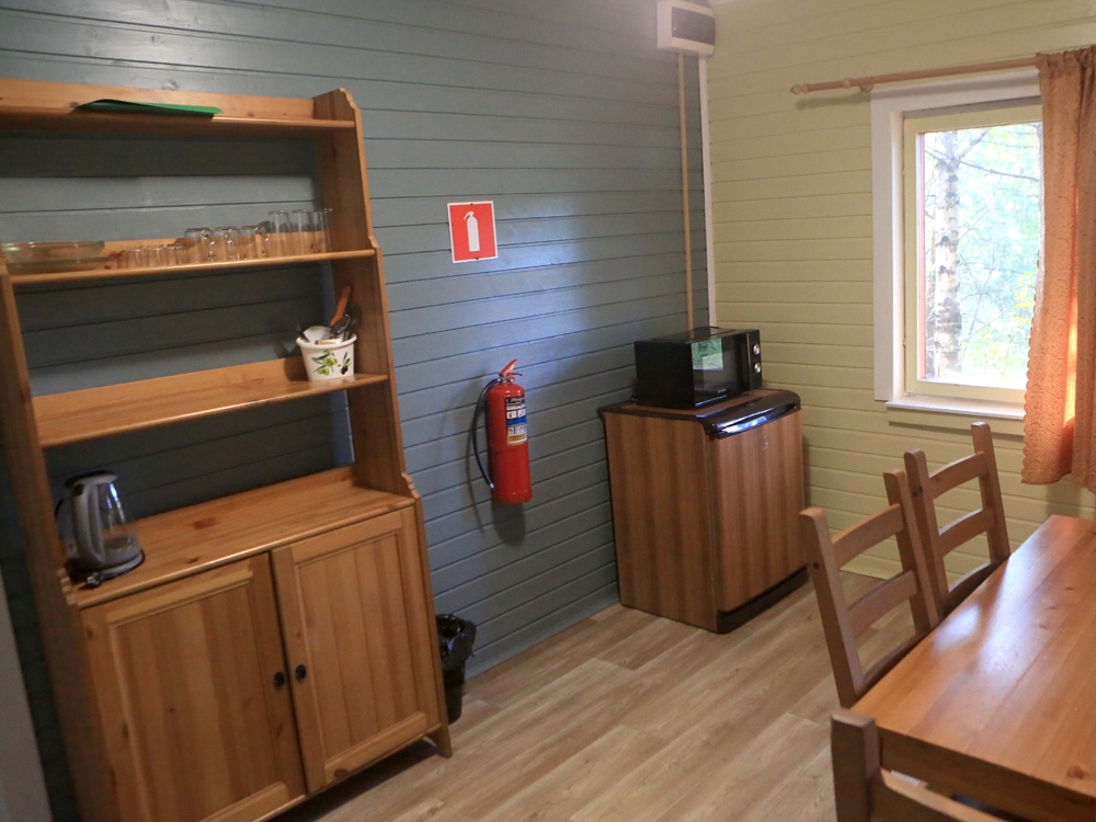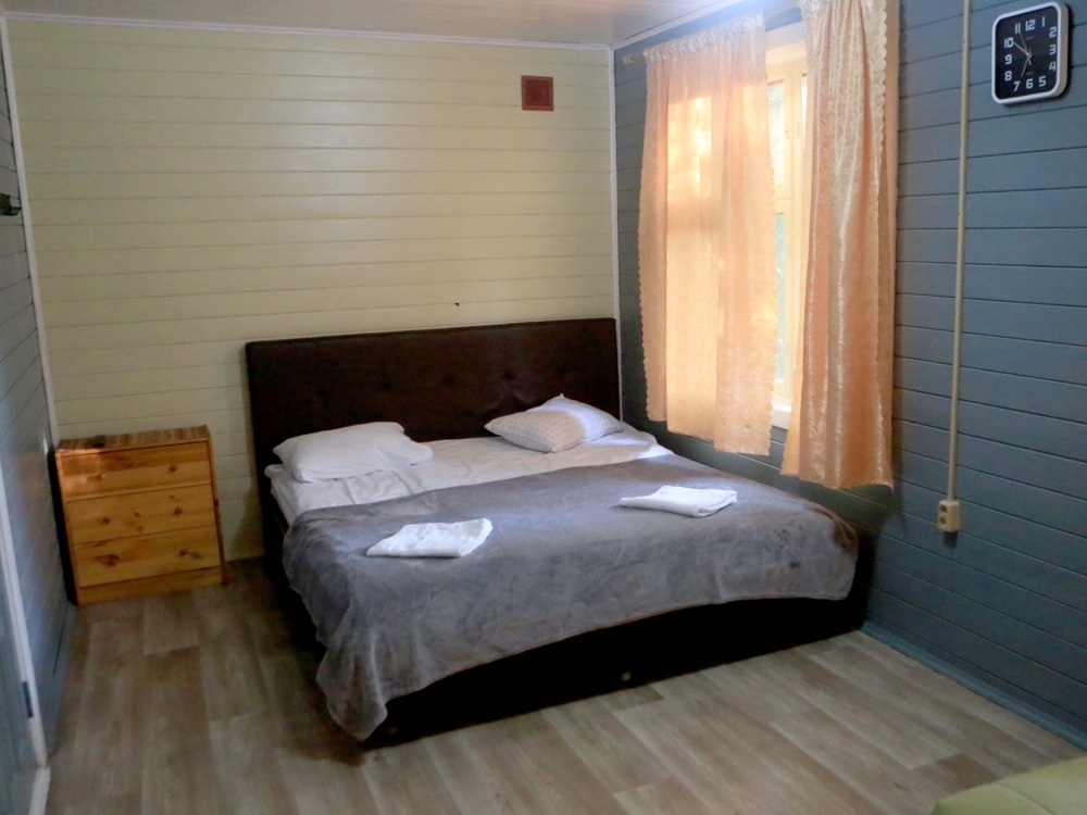 Номер категории «Коттедж № 19, 20 с баней (2 Гостя)» — Просторная комната с двуспальной кроватью, мини-кухня оснащена холодильником, микроволновой печью, электрочайником, столовыми приборами. Санузел, душевая с обливочным ведром, парная с дровяной топкой, веранда со столом и лавочками, мангал.